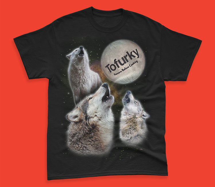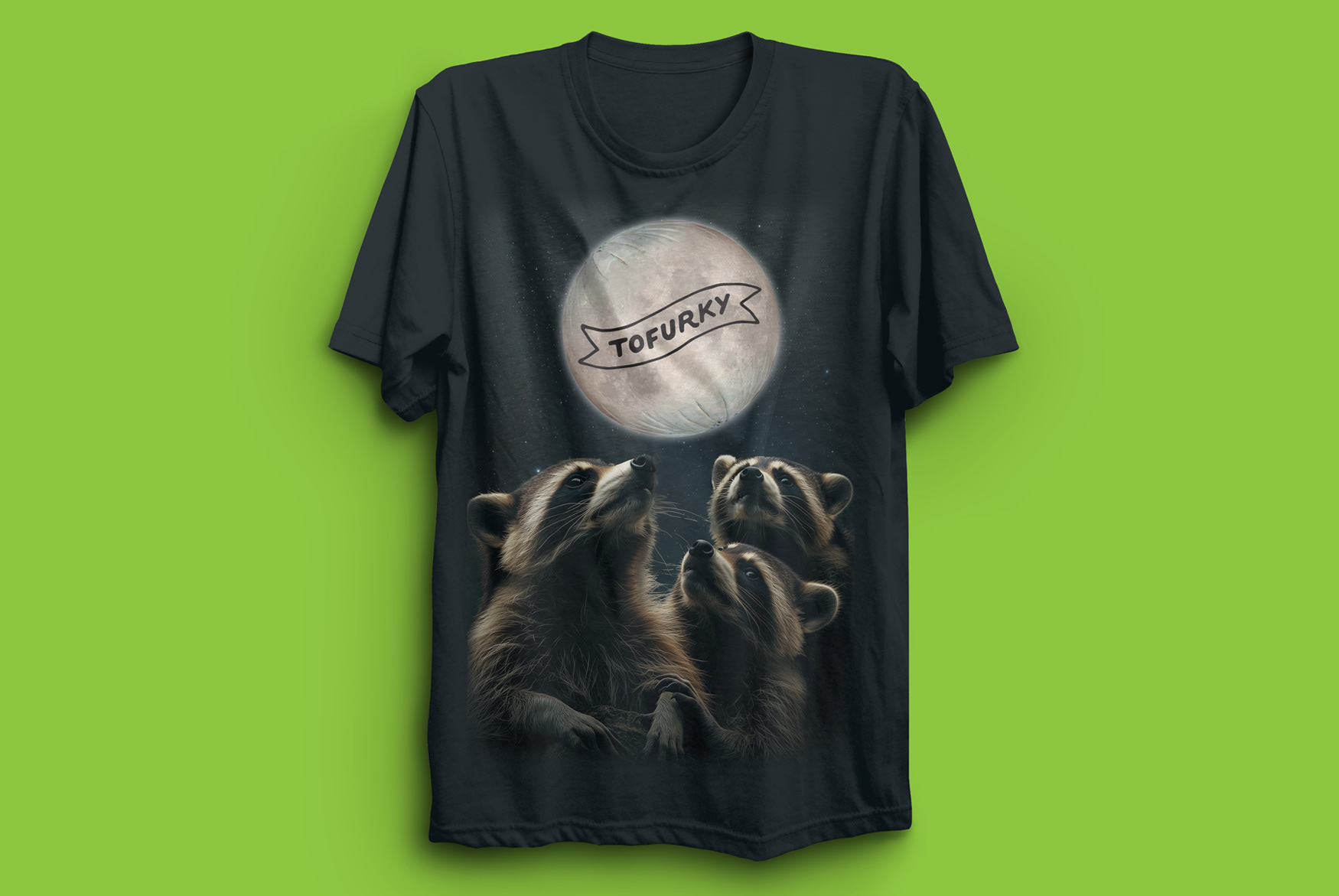 Our “wolves under the Tofurky Roast moon” shirt was such a hit the first year that I couldn’t resist riffing on the idea. Enter: raccoons under a Tofurky moon. Because who doesn’t love a cheeky little nocturnal bandit? Spoiler alert: it was a crowd favorite.