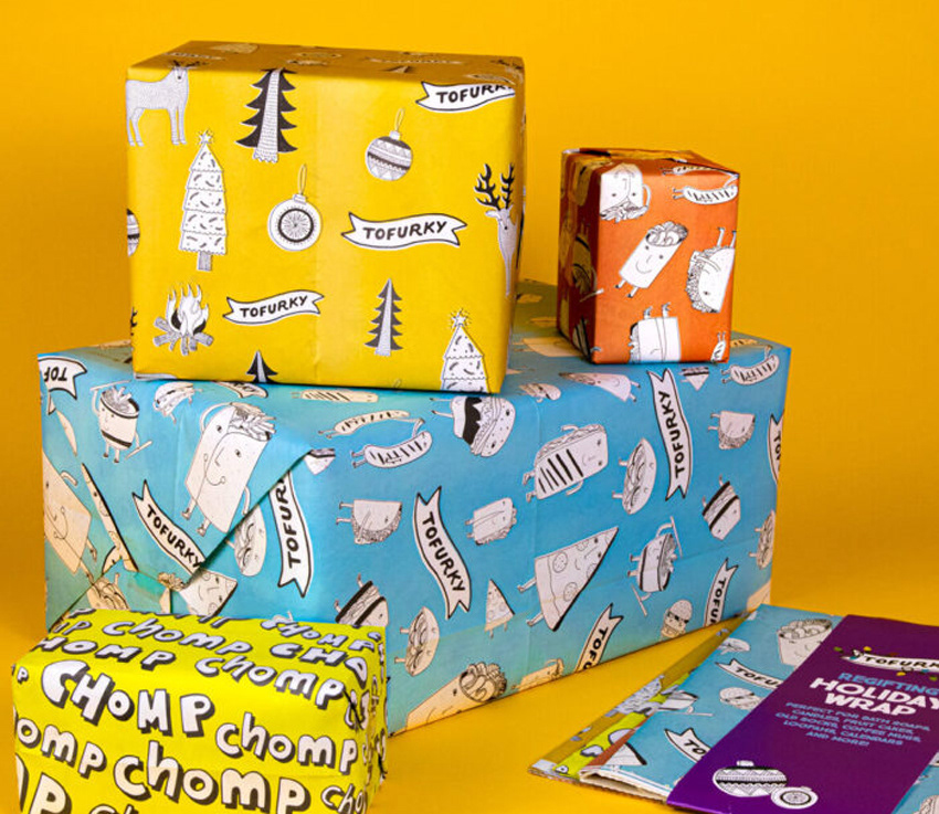 We also introduced a rugged yet plush branded blanket that people absolutely loved. And for the gift-wrap enthusiasts, we added double-sided, branded wrapping paper to the lineup. I created vibrant patterns featuring some of Tofurky’s beloved brand characters, and, of course, it was made from recycled materials—perfect for concealing those mysterious gift swap treasures!